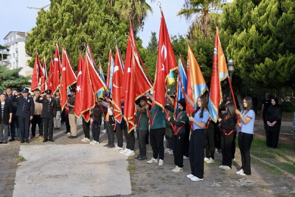 Tören, Atatürk Anıtı’na çelenk sunulmasıyla başladı. Saat 09.05’te sirenlerin çalmasıyla birlikte saygı duruşunda bulunuldu, ardından İstiklal Marşı okunarak bayraklar yarıya indirildi.