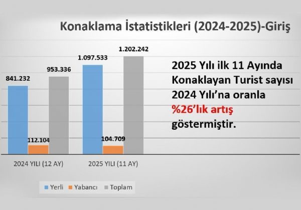 2024–2025 yılları konaklama verilerinin karşılaştırılmasına göre, 2025 yılının ilk 11 ayında Mersin’de konaklayan turist sayısı, bir önceki yılın aynı dönemine kıyasla yüzde 26 oranında arttı. Aynı dönemde turistlerin geceleme sayısında ise yüzde 22’lik artış kaydedildi.