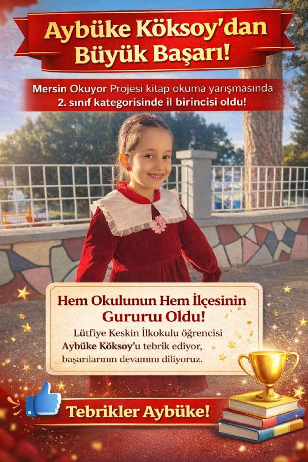 Lütfiye Keskin İlkokulu öğrencisi Aybüke Köksoy, Mersin genelinde düzenlenen Mersin Okuyor Projesi kitap okuma yarışmasında önemli bir başarıya imza attı. Yarışma kapsamında 2. sınıflar kategorisinde il birincisi olan Aybüke, hem okuluna hem de ilçesine büyük bir gurur yaşattı.