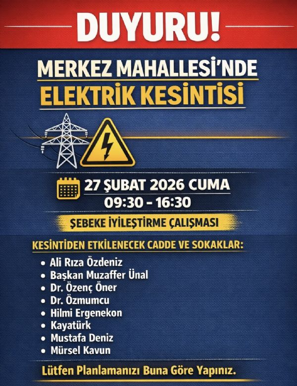 Bozyazı Merkez Mahallesinde, şebeke iyileştirme çalışmaları kapsamında 27 Şubat 2026 Cuma günü elektrik kesintisi uygulanacak.